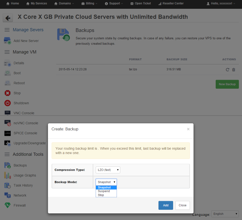 By clicking on Backup, you can take a Backup of your Cloud Server and Restore it later if you need to.
