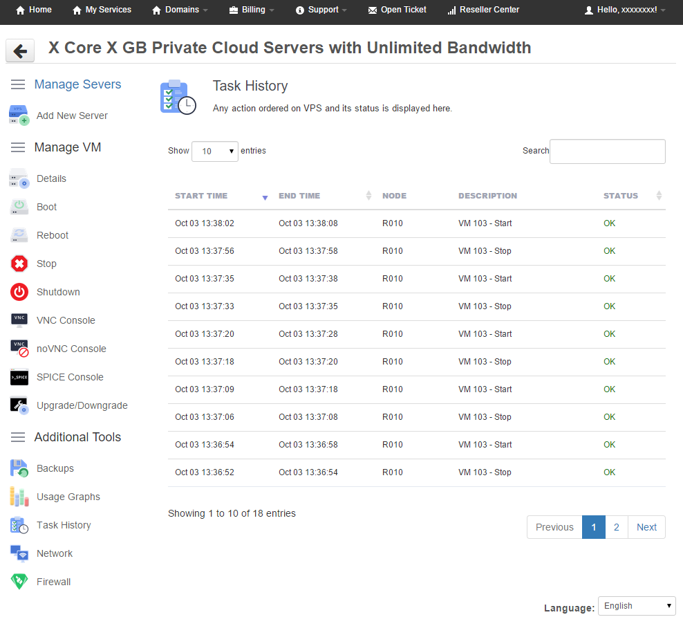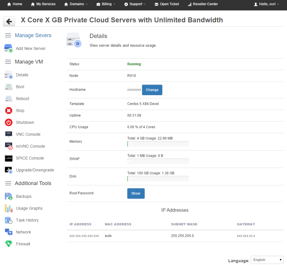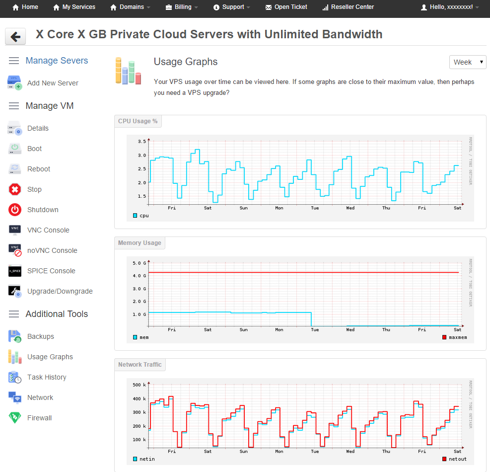 By clicking on Usage Graphs, you can View your Cloud Server's Usage Graph to see your Server's CPU, RAM, Network, and Disk Usage.