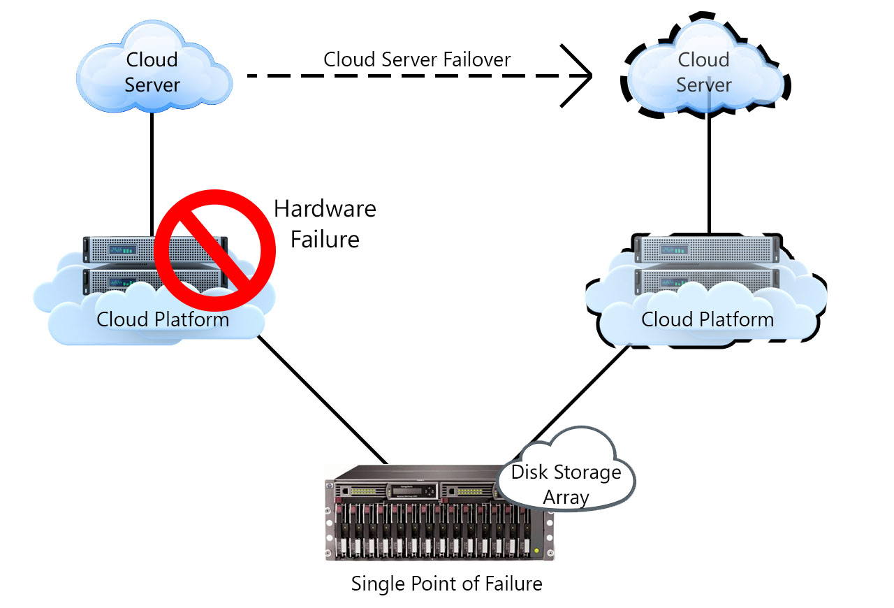 The existing Fault-Tolerant Cloud Server Architecture by most companies has a single point of failure point as shown in picture below, that is the Disk Array. If the Disk Array fails, the Cloud Servers fail as well. So practically, this system is only a 66% Fault Tolerant System.